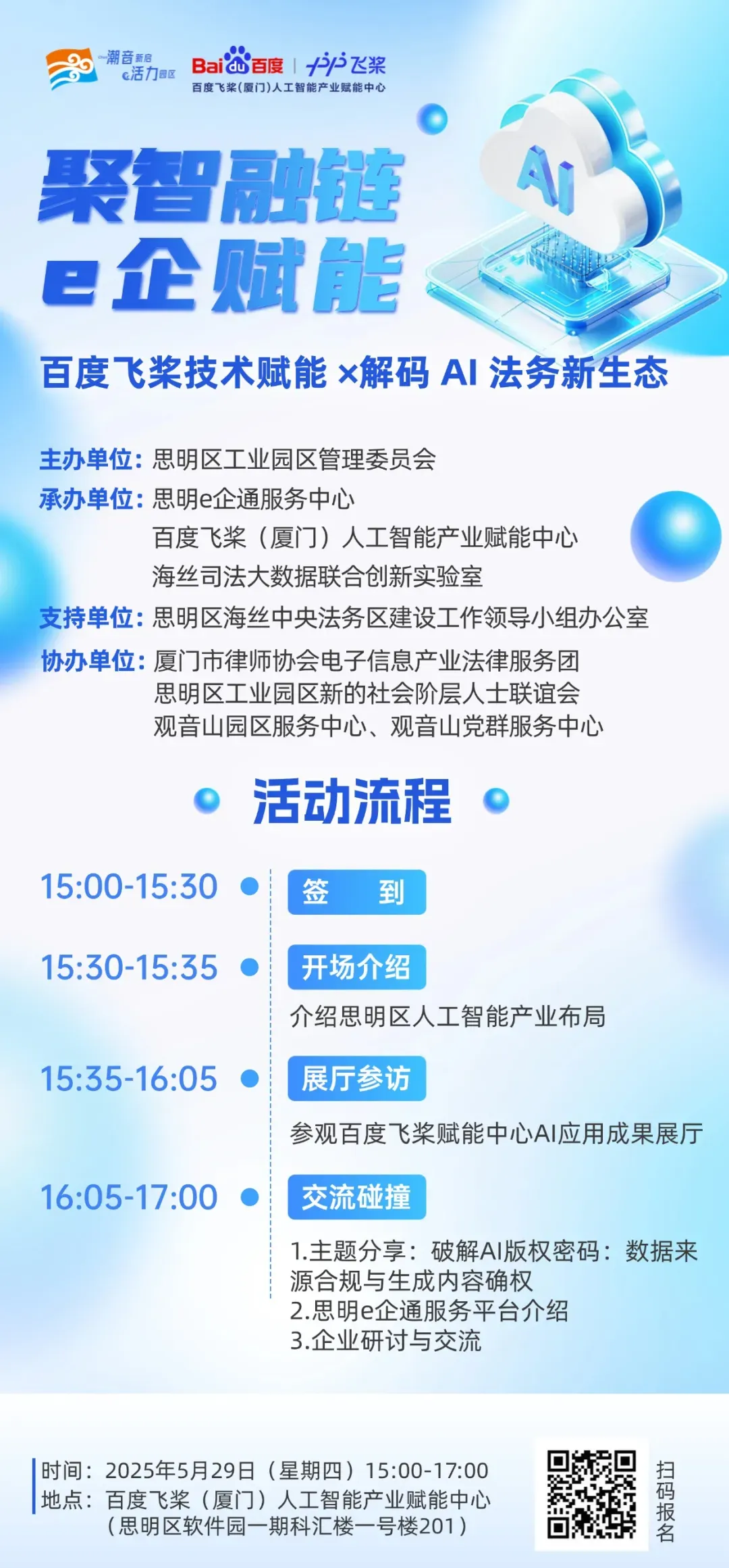 思明区工业园区管理委员会联合思明区海丝中央法务区建设工作领导小组办公室、百度飞桨(厦门)人工智能产业赋能中心、海丝司法大数据联合创新实验室等机构,重磅打造聚智融链・e企赋能主题活动 ,邀您共赴一场科技与法律的跨界之约!