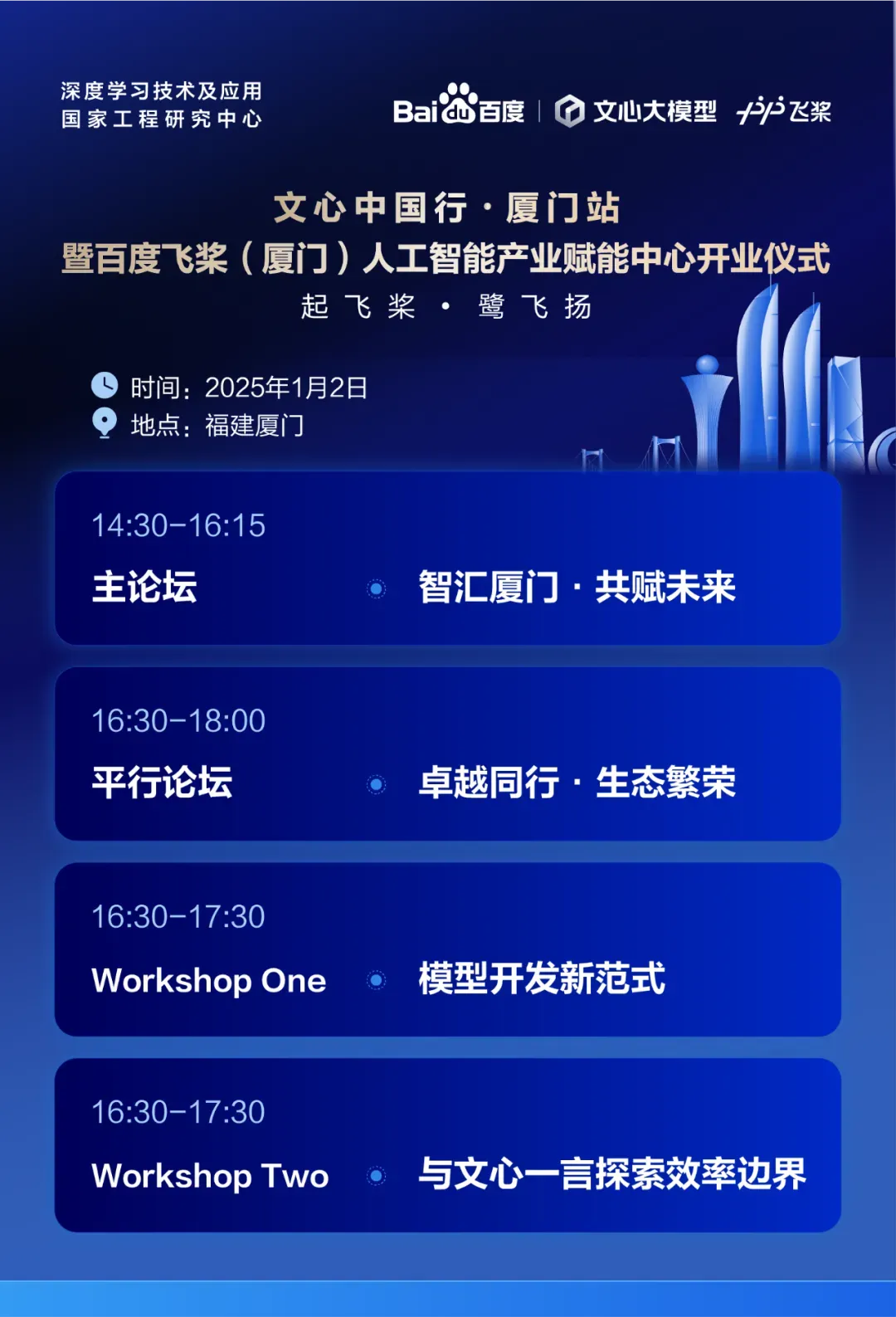 为进一步将赋能中心打造为高能级科创平台,加强对厦门产业的促进作用,百度特此举办“文心中国行·厦门站暨百度飞桨(厦门)人工智能产业赋能中心开业仪式”。“文心中国行”是由百度文心大模型和飞桨共同主办的“智立自强、科创赋能”系列活动,在深度学习技术及应用国家工程研究中心的指导和各地政府的支持下举办,旨在构建一个开放共赢的合作平台,促进产学研用的深度融合,加速AI技术在厦门特色行业中的广泛应用,为厦门的高质量发展注入澎湃动力。
