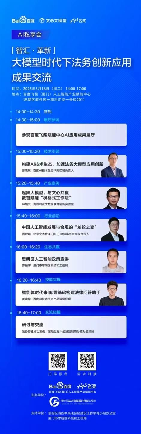 由百度飞桨(厦门)人工智能产业赋能中心与海丝司法大数据实验室联合主办的"大模型时代法务创新应用成果交流会"在厦门举行。作为海丝中央法务区核心承载地,厦门已形成涵盖高端法务机构、专业人才的产业生态。本次活动通过前沿技术分享、典型场景应用展示和智能体实操构建等环节,深度探索人工智能与法务的融合创新路径。