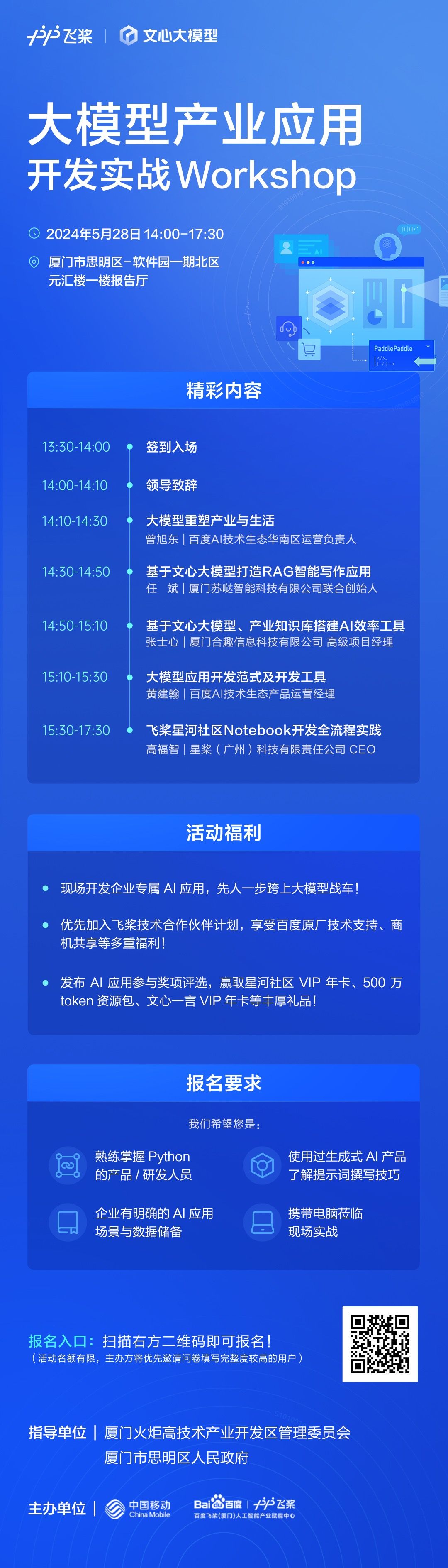 在厦门火炬高新区管委会与思明区政府的支持下,百度飞桨(厦门)人工智能产业赋能中心联合中国移动福建公司厦门分公司思明区营销中心,共同推出大模型产业应用开发实战Workshop。本次Workshop聚焦于“内容生成+知识库问答”场景。开发者们基于飞桨与文心大模型深入探索AI原生应用的开发路径,同时亲身感受大模型在AI原生应用中的魅力。
